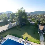 A vendégek élvezhetik a kertre néző kilátást a Fethiye városi villából. A fürdőszobákban szárító is biztosított kényelme érdekében.